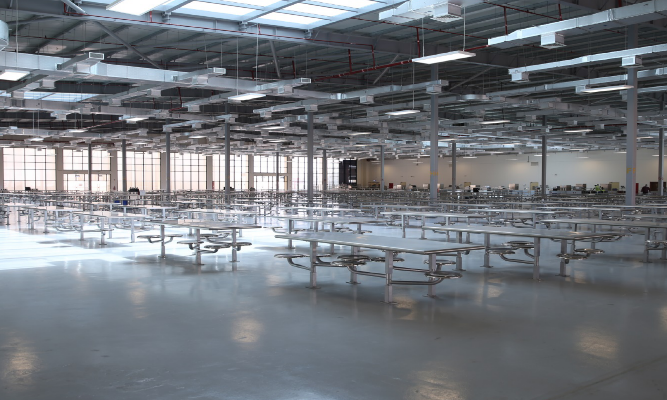 تتسع صالة الطعام لعدد 1800 مَقعد، وتحتوي على 9 خانات بالإضافة إلى 4 خطوط في كل خانة، ويتم تقسيم الخطوط حَسبَ الحالات الصّحية من قِبَل اخصائي التغذية على سبيل المثال: يكون الخط الأحمر للحمية الغذائية وأي حساسية قد يُعاني منها المُجند